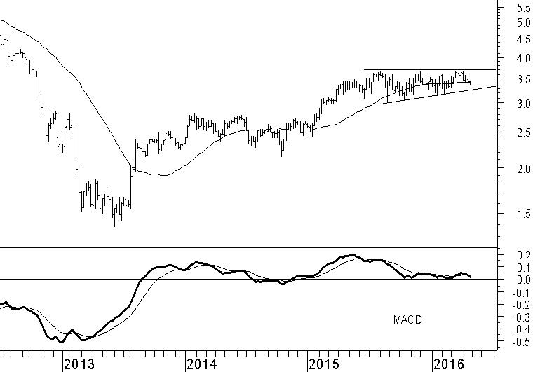 KPN staat al sinds februari vorig jaar op onze kooplijst. De aanleiding daarvoor is de start van een patroon van hogere toppen en hogere bodems. Inmiddels heeft dat de koers van KPN een stuk hoger gezet. Wel is de laatste maanden het opwaartse momentum aan het wegzakken. Een belangrijke aanwijzing daarvoor is het onvermogen van beleggers om de koers van KPN boven het hoogtepunt van 2015 uit te tillen. In de weekgrafiek blijven hierdoor drie gelijke koerstoppen achter rond €3,70. Op dit moment nadert KPN de oplopende steunlijn die een vangnet moet zijn rond €3,30. Vanaf het huidige koersniveau komt derhalve het uiterste punt nabij waarop wij een opleving verwachten. Een eventuele val onder €3,30 maakt direct een einde aan de stijgende trend. Ons favoriete scenario is echter een opleving van de koers richting de weerstand rond €3,70, gevolgd door een uiteindelijke doorbraak. Alle reden daarom om het bestaande koopadvies nogmaals onder de aandacht te brengen.