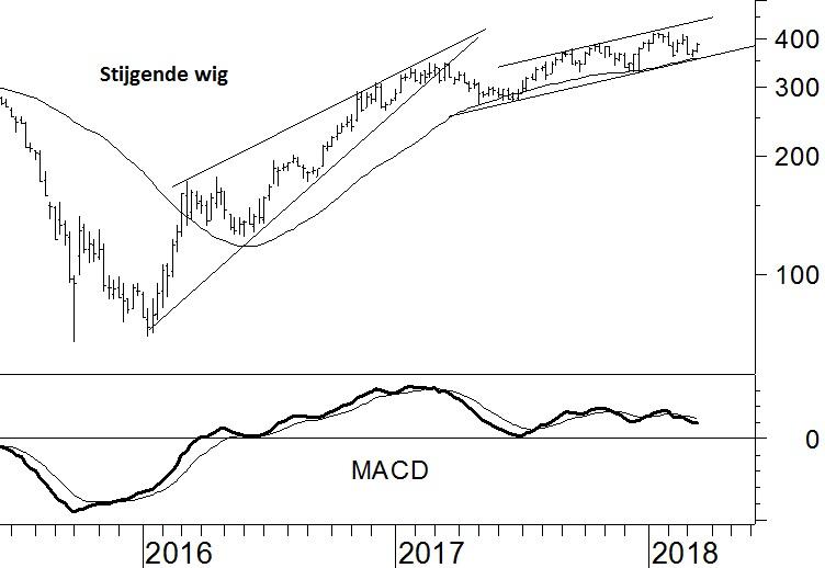 Het was in technisch opzicht ook te verwachten dat Glencore het wat kalmer aan zou gaan doen. In 2016 was namelijk een zogeheten stijgende wig zichtbaar geworden. Zo’n wig wordt bijna altijd aan de onderkant doorbroken, zeker als hij steil verloopt, zoals bij Glencore het geval was. De koers is nu in rustiger vaarwater terechtgekomen. En dat is prima: zolang de koers zich in het nieuwe stijgende trendkanaal beweegt, blijft het koopadvies van kracht.
