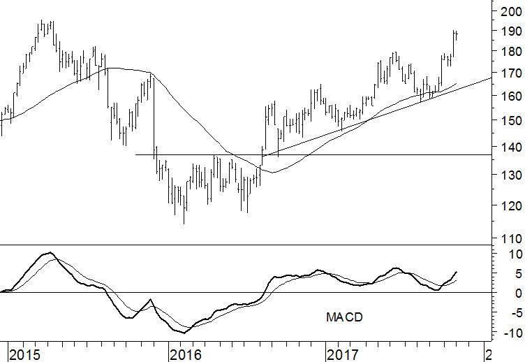 Linde kent nog steeds een sterk trendbeeld. Dat is al het geval sinds augustus 2016, toen het aandeel met overtuiging boven de weerstand rond €137 wist uit te breken. In de tussentijd is het patroon van hogere toppen en bodems niet aangetast. Recent is zelfs een nieuw hoofdstuk aan de zegetocht toegevoegd met een hoogste koersniveau in meer dan twee jaar. Met dit uiterst gezonde trendbeeld in gedachten, verwachten wij dat de stijgende trend zonder veel moeite zal worden voortgezet. Het hoogtepunt uit 2015 op €195 is daarbij het koersdoel. Dit kan binnen enkele weken worden bereikt.