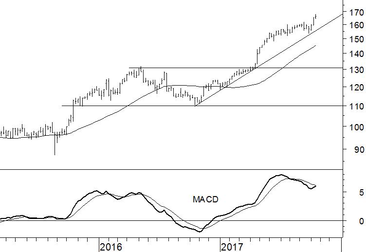 Aan de onderkant wordt de stijgende trend gesteund door de trendlijn die zich bevindt onder de bodems vanaf eind 2016. Op dit moment snijdt deze door $155. Of het tot een correctie komt is echter onzeker. De kans is groot dat McDonald’s de weg omhoog zonder omkijken vervolgt. Daarom is er geen alternatief is voor het huidige koopadvies.
