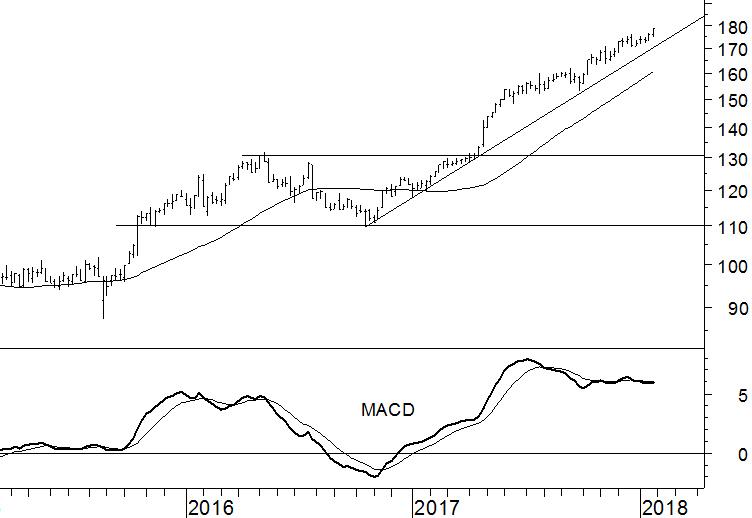 McDonald’s (MCD) kent een smetteloos technisch beeld. Sinds de start van de huidige stijgende trend in februari vorig jaar heeft het aandeel niet meer achterom gekeken. De weekgrafiek laat een indrukwekkend stabiel verloop van de stijgende trend zien. Meerdere keren zijn door ons gestelde koersdoelen overtroffen en opwaarts bijgesteld. Waarschijnlijk zal het actuele koersdoel op $180 hetzelfde lot zijn beschoren.