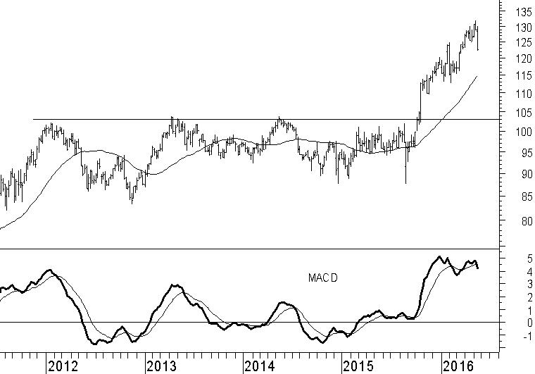 McDonald’s (MCD) lijkt aan de vooravond te staan van een flinke correctie. Dat verwachten wij gezien de uitzonderlijke snelheid van de stijging sinds oktober vorig jaar, die het aandeel vatbaar maakt voor een bijstelling. Dat wordt bevestigd door de MACD-indicator. Die laat in tegenstelling tot de weekgrafiek geen nieuw hoogtepunt zien. Hierdoor is negatieve divergentie ontstaan en vaak wordt zo’n situatie gevolgd door een correctie van enige betekenis. Dat is dan ook onze verwachting voor de komende weken. Het 40-weeks gemiddelde voorziet rond $115 in een eerste vangnet voor het overtollige aanbod.