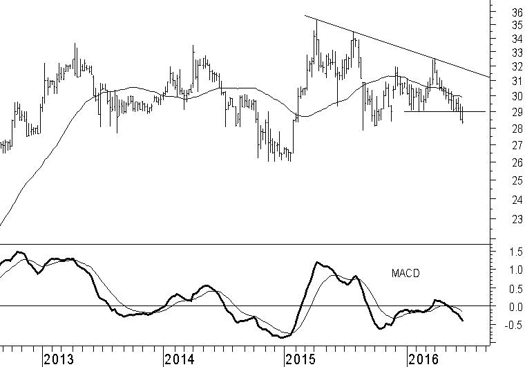 Nedap laat een verzwakking zien van het technische beeld. Tot recent leken vraag en aanbod goed in evenwicht met elkaar en wist Nedap zich gesteund door het bodemniveau van dit jaar rond €29. Onlangs is dit steunniveau op een overtuigende manier gesneuveld en daarmee start het aandeel een nieuwe dalende trend. Deze trend wordt bevestigd door de negatieve positie en de richting van de MACD-indicator. Ook het 40-weeks gemiddelde beweegt in neerwaartse richting. Al met al wijst dat erop dat beleggers afscheid nemen van hun aandelen Nedap. Wij verwachten dat dit proces zal aanhouden en dat de nieuwe dalende trend wordt uitgebouwd. Dat betekent dat de neerwaartse risico’s zijn toegenomen.