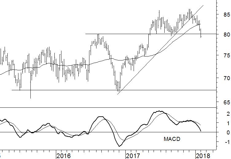 De koersval in januari onder de stijgende steunlijn was weliswaar een verzwakking van het beeld, maar maakte geen eind aan de stijgende trend. De recente val onder het 40-weeks gemiddelde rond CHF83 wél. Tot overmaat van ramp is ook het horizontale steunniveau rond CHF80 kwetsbaar gebleken.