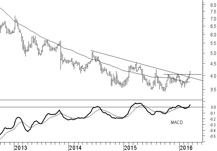 Nieuwe Steen Investments (NSI) heeft de standvastige belegger in het aandeel jarenlang weinig plezier gebracht. Een trendvolgende belegger had overigens in de jaren 2011-2015 het aandeel helemaal buiten de portefeuille gelaten, want de trend was in deze jaren duidelijk neerwaarts gericht. Langzaam maar zeker draait het technische beeld nu echter in positieve richting. NSI heeft recent het proces van bodemvorming afgerond en kijkt na lange tijd weer naar boven. Vooral de doorbraak boven de weerstand op €4,05 heeft ons ervan overtuigd dat er een nieuwe fase is aangebroken in het technische beeld. We verwachten dat er in de komende weken en maanden een voortzetting van de nieuwe stijgende trend komt. Op de langere termijn is daarbij het hoogtepunt van 2014 op €5,00 het uiteindelijke koersdoel. Het aandeel kan dus weer worden opgenomen in de Nederlandse portefeuille. Vanzelfsprekend laten wij de verbetering van het technische beeld gepaard gaan met een nieuw koopadvies.