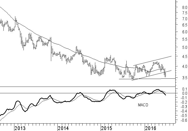 NSI maakt de belofte van hogere koersen niet waar. Tot enkele weken geleden gingen wij uit van een gematigd oplopend trendkanaal dat het aandeel naar hogere koersniveaus kon brengen. Immers, het 40-weeks gemiddelde kende een opwaarts verloop. Ook wijzen de hogere koersbodems in de weekgrafiek op een aanhoudende koopinteresse onder beleggers. Echter, de recente val onder het trendkanaal legt een bom onder de structuur van het stijgende trendkanaal. Een aanvullende verzwakking van het technische beeld is de recente dip van de MACD-indicator onder de nullijn. Dat geeft aan dat het koersmomentum in neerwaartse richting draait. Voor de komende weken tot maanden wijst dit op een zijwaartse tot lagere koersvorming. De ondergrens daarbij leggen wij op €3,45. Dat is het dieptepunt van 2015. Beleggers met NSI in de portefeuille kunnen het aandeel aanhouden, gelet op het beperkte neerwaartse risico. Het advies wordt verlaagd naar ‘houden’.