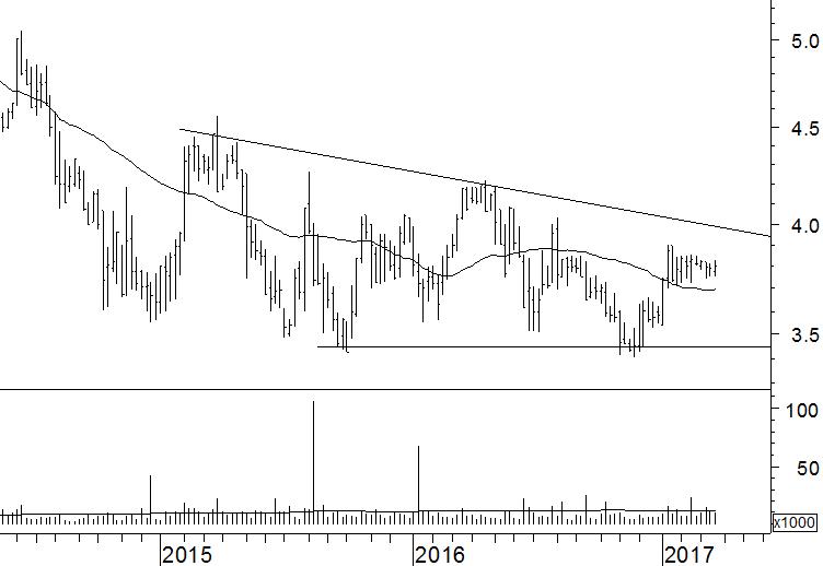 De onderkant van het patroon is duidelijk en wordt gemarkeerd door twee koersbodems rond €3,45. Aan de bovenkant is sprake van een dalende weerstandslijn die druk uitoefent op het koersverloop. Momenteel loopt deze bovengrens rond €4,00. NSI is richtingloos zolang het aandeel binnen deze grenzen blijft.