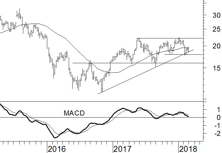 Het is OCI niet gelukt om af te rekenen met de weerstand op €22. Daardoor laat het aandeel nu een neutraal koersbeeld zien. Volgens de klassieke Dow-theorie vormen toppen uit het verleden belangrijke weerstandsniveaus. Om in een opwaartse trend te blijven, moet de koers steeds in staat zijn de weerstand van vorige toppen uit te nemen. Dat lukte OCI rond de jaarwisseling niet meer. Daarnaast is het 40-weeks gemiddelde zich zijwaarts gaan bewegen.