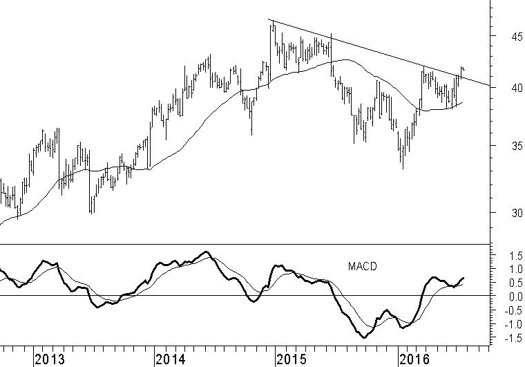 Oracle (ORCL) heeft opnieuw een stap gezet in de richting van een sterker technisch beeld. Deze stap is genomen met de doorbraak boven de weerstand rond $41. De trendlijn die het tempo aangaf van de daling van de laatste anderhalf jaar is niet bestand gebleken tegen de koopinteresse van beleggers, zo is te zien in de weekgrafiek. Ook positief is dat tijdens de correctie in de maand juni het koersverloop van Oracle niet onder het 40-weeks gemiddelde is gevallen. De verbetering van het technische beeld wordt ondersteund door een positief gekruiste MACD-indicator. In de komende weken tot maanden verwachten wij hogere koersen voor Oracle. Uiteindelijk moet het daarbij mogelijk zijn om het hoogtepunt van 2015 rond $45 te evenaren. Dit positieve scenario komt alleen in gevaar wanneer de koers alsnog wegzakt onder de gemiddeldelijn rond €39. Het advies wordt verhoogd naar ‘kopen’.