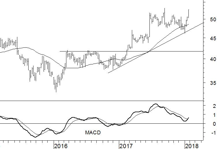 Het wachten is op een evenaring van het koersdoel op $55. Op een termijn van meerdere maanden zijn hogere niveaus waarschijnlijk. Zeker ook omdat het momentum in de stijgende trend weer toeneemt, zoals blijkt uit de opwaartse kruising van de MACD-indicator. Al met al een gepast moment om ons advies te herhalen: ‘kopen’.