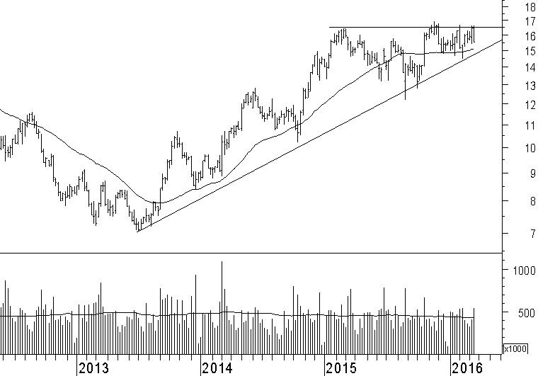 Orange bevindt zich in een stijgende langetermijntrend. Dat is goed te zien aan het oplopende karakter van de onderliggende steunlijn en de koersvorming van Orange boven het 40-weeks gemiddelde. Maar eerlijk gezegd ontbreekt de overtuiging en hapert de opmars in het aandeel. Telkens is de weerstand rond €16,50 de boosdoener. Blijkbaar is daar een collectieve verkoopinteresse gevestigd die voor een overvloed aan aanbod zorgt. De vraag is welke van de twee krachten uiteindelijk gaat winnen. Voorlopig zetten wij in op de kracht van de stijgende trend op de lange termijn. Elke correctie terug naar de steunlijn rond €15 is een goed koopmoment voor speculatieve beleggers. Onze verwachting is dat de weerstand uiteindelijk rond €16,50 zal sneuvelen. Voorzichtige beleggers, zoals wij, wachten op een bevestiging daarvan alvorens de positie in aandelen Orange uit te breiden. Het koopadvies blijft sowieso gehandhaafd totdat het €15-niveau sneuvelt.