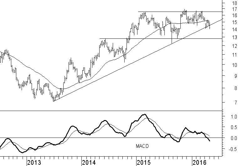 Orange is eind maart nog door ons besproken. Toen worstelde het aandeel om de horde van €16,50 te nemen. Dat is uiteindelijk niet gelukt. De aanhoudende koersdruk rond €16,50 heeft het aandeel nu teruggebracht tot onder belangrijke steunniveaus rond €15. Daarmee doet zich een flinke verzwakking voor van het technische beeld. Immers, het aandeel handelt nu onder het 40-weeks gemiddelde en onder de oplopende steunlijn beneden de bodems vanaf 2013. De langetermijntrend is gebroken, net als onze verwachting dat uiteindelijk de opgaande lijn wordt voortgezet. Met de verzwakking van het technische beeld is het waarschijnlijk dat Orange zich in de komende maanden hoofdzakelijk zijwaarts voortbeweegt waarbij het steunniveau rond €12,80 een belangrijke ondergrens is.