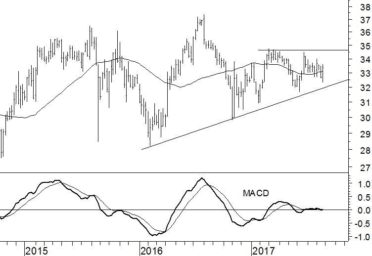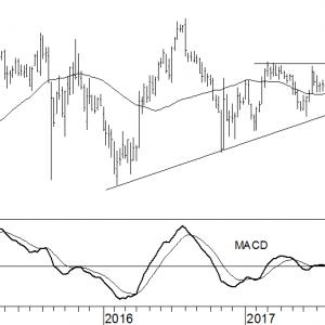 Pfizer (PFE) maakt al dit hele kalenderjaar een lusteloze indruk. Zonder enig gevoel voor richting kronkelt de beurskoers rond het 40-weeks gemiddelde en ligt de MACD-indicator langgerekt op de nullijn. En toch voorzien wij dat PFE de wachtkamer uiteindelijk aan de bovenkant zal verlaten. Deze verwachting is gestoeld op het feit dat alle opeenvolgende bodems sinds begin 2016 op een hoger niveau terechtkwamen. Onderliggend is blijkbaar sprake van enige koopinteresse.