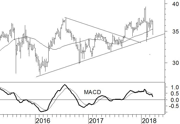 De koers laat echter nog altijd een patroon van hoger liggende toppen en bodems zien, hoewel er sprake is van diverse flinke uitschieters. Ook de steunlijn is nog niet serieus getest, laat staan doorbroken. De stijgende steunlijn heeft in het verleden steeds als vangnet gediend bij koersdalingen. Bij de huidige correctie verwachten we hier ook nu weer veel van. Reden om ons koopadvies vooralsnog te handhaven.