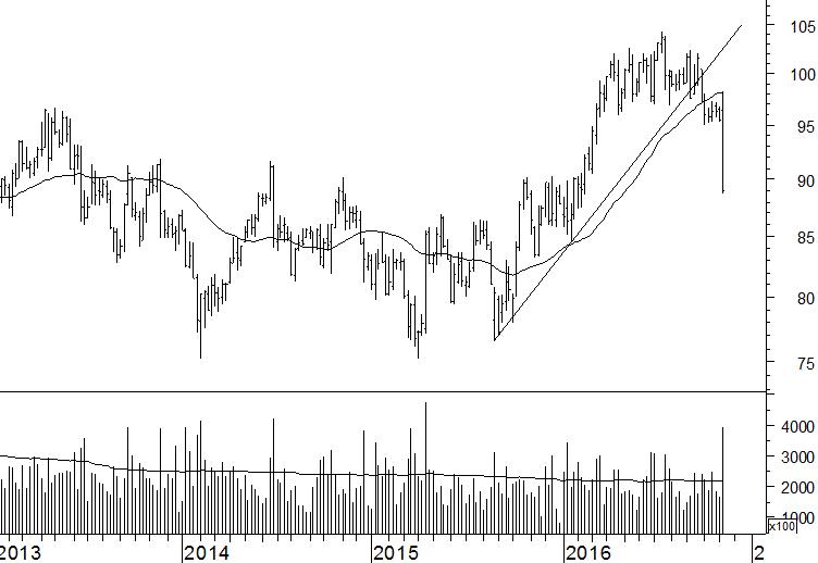 Philip Morris International (PM) valt duidelijk door de mand. Van het positieve koersbeeld in september is niets meer over. Toen steunde het aandeel nog op de stijgende trendlijn en het 40-weeks gemiddelde rond $98. Dit vangnet stond de laatste weken al sterk onder druk, maar met de koersval van afgelopen week is er geen twijfel meer. De stijgende trend is verlaten onder bovengemiddelde omzetten.