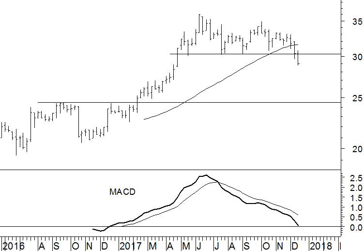 Ons vertrouwen in het positieve scenario was gevestigd op het 40-weeks gemiddelde, dat rond €32 voor een opleving in de koers had moeten zorgen. Zo ver is het echter niet gekomen. In plaats daarvan zakte het aandeel recent zelfs onder het steunniveau rond €30.