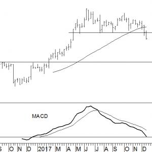 Overduidelijk is daarmee de stijgende trend gesneuveld in de koersgrafiek van het aandeel. Wij verwachten dat de koers de komende weken nog wat verder zal wegzakken, bij gebrek aan onderliggende steunniveaus. Ook de MACD-indicator voorspelt niet veel goeds. We beginnen met een adviesverlaging naar ‘houden’ en sluiten een verder verval niet uit.