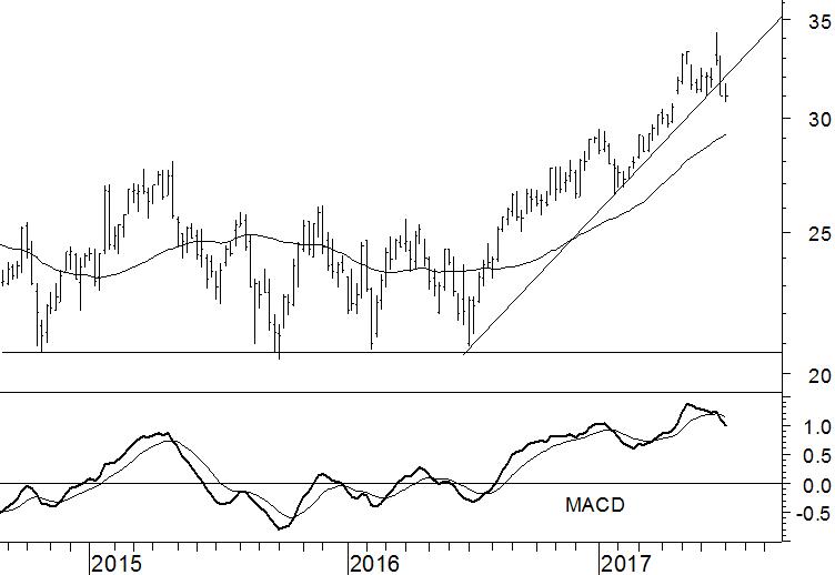 Philips geniet al bijna een jaar van de heersende stijgende trend in de weekgrafiek. Wel baart het ons zorgen dat de stijgende steunlijn onder de bodems vanaf medio 2016 recent is gebroken. Ook de MACD-indicator is onlangs negatief gekruist. Dat geeft aan dat het opwaartse momentum afneemt, en dat er binnen het positieve koersbeeld ruimte is voor een correctie. Deze ruimte wordt in eerste instantie bepaald door het 40-weeks gemiddelde rond €29. Daar zal blijken of er nog voldoende koopinteresse is om de stijgende trend een vervolg te geven. Wij verwachten van wel.