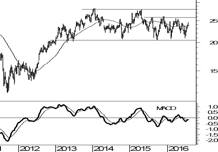 Philips heeft koerstechnisch weinig meer opgeleverd sinds het aandeel in 2012 de grens van €20 doorbrak. Sindsdien fluctueert het aandeel tussen €20 als steun en €28 als weerstand. De laatste maanden is deze bandbreedte zelfs wat nauwer met weerstand iets onder €26. Voor de komende periode kunnen alle op- en neergaande bewegingen die zich binnen deze range afspelen worden afgedaan als ruis. Pas boven €28 of onder €20 kiest Philips weer een echte richting die langer zal duren dan enkele weken. Kenmerkend voor het zijwaartse koersverloop is dat het 40-weeks voortschrijdend gemiddelde zich met een niveau van €24 midden in de beschreven range bevindt. Ook de MACD-trendindicator moddert wat rondom de nullijn.