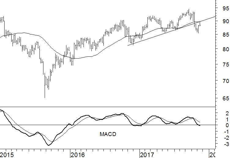 Procter & Gamble (PG) liet dit jaar tot voor kort alleen maar een positief technisch beeld zien. Weliswaar verliep het patroon van toppen en bodems slechts geleidelijk omhoog, de richting was duidelijk. Een paar weken terug kwam er een kink in de kabel. Het aandeel kwam duidelijk onder het 40-weeks gemiddelde terecht en ook de oplopende steunlijn werd gebroken.