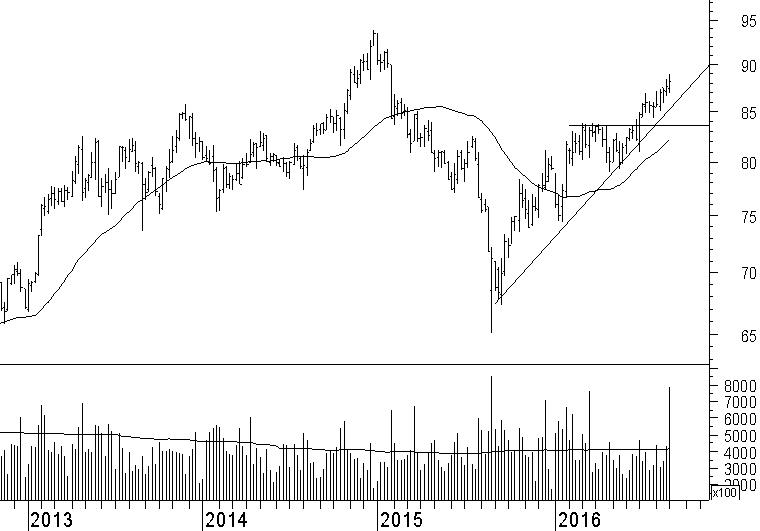 Procter & Gamble (PG) heeft de stijgende lijn ingezet in februari van dit jaar. Sindsdien heeft het aandeel niet achterom gekeken, waarbij de doorbraak van eind juni boven $84 een belangrijke bevestiging was van de stijgende trend. Voorlopig zien wij geen gevaar voor de stijgende trend en zien wij Procter & Gamble de ingezette weg voortzetten naar het koersdoel op €93. Op dat niveau bevindt zich het hoogtepunt van december 2014, waardoor hier een natuurlijk weerstandsniveau ligt. Aan de onderkant is het aandeel beschermd door de oplopende steunlijn die momenteel door $87 snijdt. Zelfs een eventuele doorbraak daarvan maakt nog geen einde aan het positieve technische beeld. Rond de eerder genoemde $84 zal de oude weerstand nu als steunniveau fungeren.