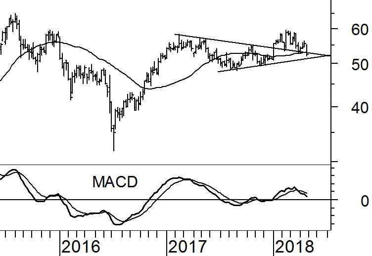 Randstad staat sinds begin dit jaar op ‘kopen’. De uitbraak uit de getekende symmetrische driehoeksformatie was hiervoor de aanleiding. Wat we zien is dat het aandeel nog geen afscheid heeft weten te nemen van deze driehoek. Er zijn echter diverse redenen om het positieve advies overeind te houden. Zo komen rond de huidige koers diverse steunniveaus samen: de dalende driehoekslijn, het 40-weeks voortschrijdend gemiddelde én de stijgende steunlijn. Die laatste kan worden getrokken onder de bodems die zich hebben gevormd sinds medio vorig jaar.