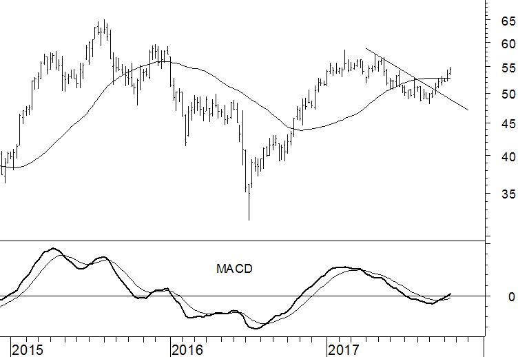 Randstad maakte een wat zwakkere periode in het koersverloop door, maar inmiddels zijn de perspectieven aanzienlijk verbeterd. Het aandeel heeft de draad van de stijgende trend weer opgepakt en de vooruitzichten zijn positief. Randstad boezemt vertrouwen in doordat het een aantal technische barrières heeft weten te doorbreken. Allereerst rekende het aandeel in september af met de dalende weerstandslijn. Inmiddels is de koers ook weer terug boven het 40-weeks gemiddelde, waarmee de tweede barrière is overwonnen. Met de recente positieve kruising van de MACD-indicator boven de nullijn ziet de toekomst er helemaal florissant uit.