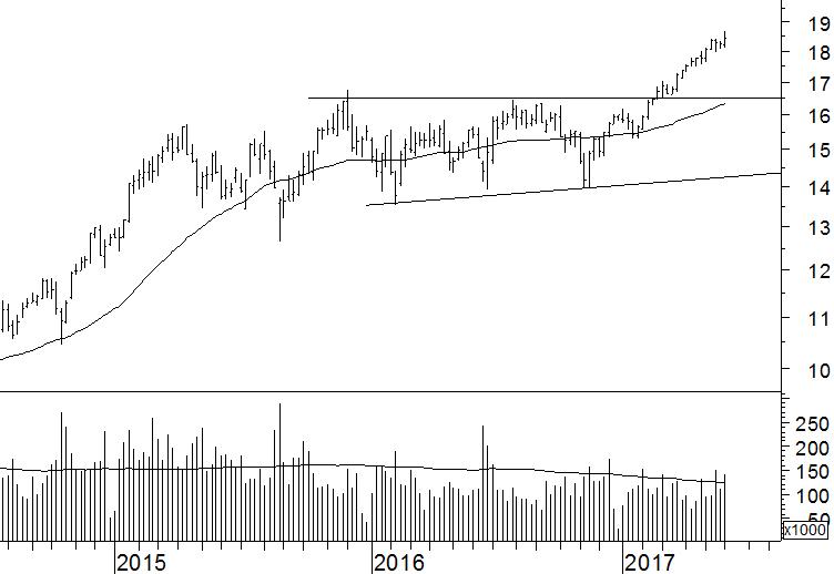 RELX laat een sterk trendbeeld zien. Sinds de doorbraak boven de weerstand rond €16,50 in februari is de stijgende trend krachtig uitgebouwd. Overigens is de huidige stijgende trend al in 2012 begonnen.