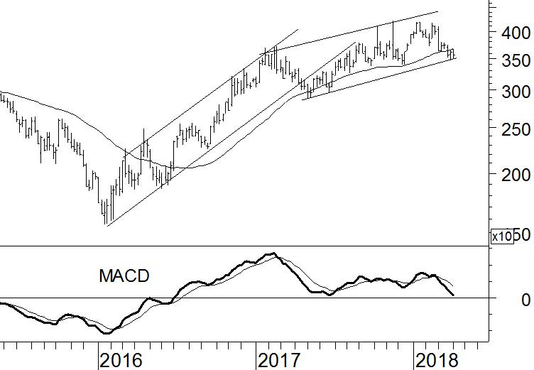 Beleggers blijven positief, maar gaan het wel rustiger aan doen. De koers probeert nu steun te vinden aan de onderkant van het stijgend trendkanaal. Het meest waarschijnlijke scenario is dat het aandeel hier houvast krijgt en naar de bovenkant van het kanaal gaat. Sinds halverwege 2016 is de hellingshoek van het stijgende 40-weeks gemiddelde ook geleidelijk aan minder positief geworden.