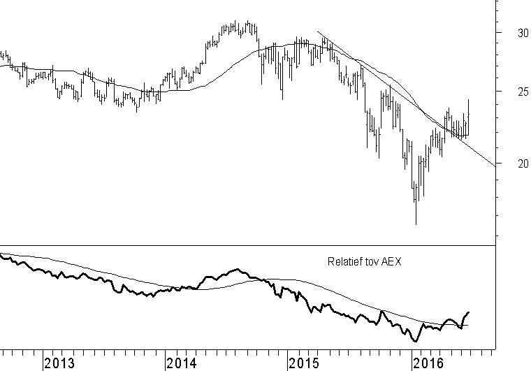 Royal Dutch Shell bewijst zich voor het eerst in lange tijd als een veilig baken in een periode van onzekerheid. Zelfs in de week waarin de keuze voor een Brexit een feit werd wist het aandeel te klimmen. Inmiddels is het technische beeld sterk genoeg om te spreken van een nieuwe stijgende trend. Nadat het aandeel zich wekenlang wist te handhaven boven het 40-weeks gemiddelde kiest Royal Dutch Shell de weg omhoog. Onze verwachting is dat het aandeel deze weg zal vervolgen. Het minst waarschijnlijke scenario is een daling onder het steunniveau rond €21,50. Ook een teken van kracht is de relatieve prestatie ten opzichte van de AEX-index. Onder in de grafiek wordt dat duidelijk aan de hand van de relatievesterktelijn, waarin ook een nieuwe stijgende trend van start is gegaan.