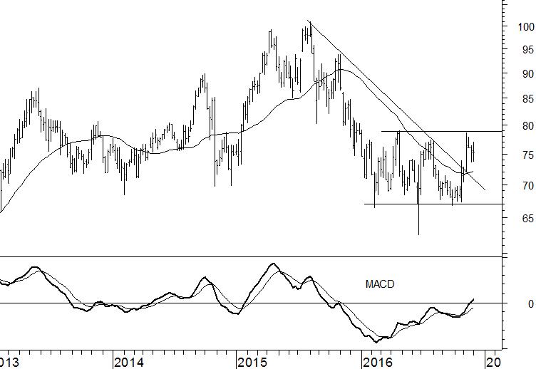 Met overtuiging heeft Sanofi nu afstand genomen van de dalende trend. Een zijwaartse beweging is de komende maanden het meest waarschijnlijk. De bandbreedte daarvoor wordt aan de bovenkant begrensd door een tweetal koerstoppen rond €79. De onderkant komt uit rond €67 en wordt gevormd door diverse koersbodems. Het trendbeeld blijft binnen de bandbreedte neutraal en wij wijzigen het advies in ‘houden’.
