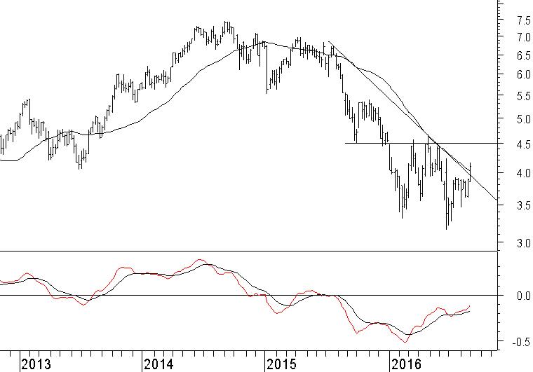 Santander heeft vanaf medio 2014 twee jaar lang onder zware koersdruk gestaan. Half juni schreven wij nog dat die situatie kon voortduren en stelden wij €3,30 als koersdoel. Dat niveau is inmiddels bereikt en sindsdien laat Santander de eerste tekenen zien van een verbetering van het technische beeld. Vooral de doorbraak boven zowel de dalende weerstandslijn als het 40-weeks gemiddelde maakt indruk. Deze beide ijkpunten boden rond €4 een stevige weerstand. Met het doorbreken daarvan is de kou uit de lucht. Ook bemoedigend is dat de MACD-indicator weer omhoog beweegt al is dat nog steeds onder de nullijn. Voor nog grotere euforie is het dan ook te vroeg.