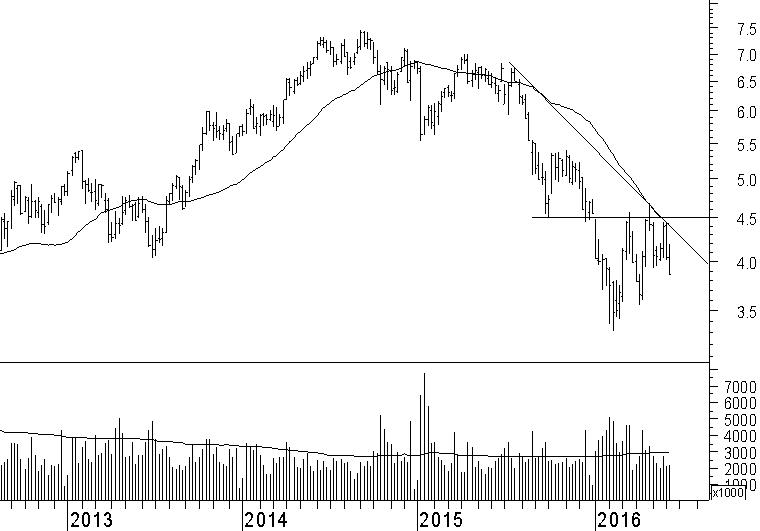 Santander leek zich de laatste maanden te stabiliseren na de zware koersdaling in 2015. Een tastbare verbetering van het technische beeld bleef daarbij telkens buiten bereik. De weerstand rond €4,50 is meerdere malen een obstakel gebleken. Zowel het 40-weeks gemiddelde als de dalende weerstandslijn houdt rond dat niveau de druk op het koersverloop. Nu wordt duidelijk dat het aandeel is afgeketst tegen het €4,50-niveau. Onze verwachting is dan ook dat de dalende trend spoedig weer zal worden opgepakt. Een evenaring van het dieptepunt van eerder dit jaar op €3,30 is een realistisch scenario. Om te ontsnappen aan dit negatieve scenario is het nodig dat de eerder genoemde weerstandslijn en gemiddeldelijn rond €4,50 worden gebroken. Voorlopig zien we dat niet gebeuren. Beleggers met aandelen Santander doen er verstandig aan deze te verwijderen uit de portefeuille. Het advies wordt verlaagd naar ‘verkopen’.