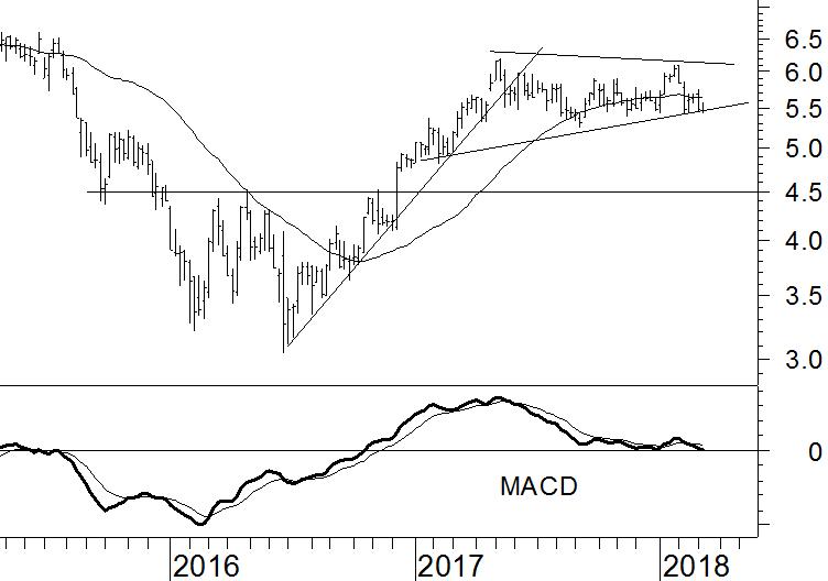 Het meest waarschijnlijke scenario is dat beleggers op adem komen, en dat Santander daarna de oorspronkelijke trend (die stijgend was) hervat. Het andere scenario is dat de koopkrachten verder afnemen en de koers door de onderkant van de driehoek zakt, waarna het aandeel een toppatroon voltooit. Rond €5,30 ligt nog steun, daaronder doemt de €4,50 op. Zolang beleggers geen richting kiezen, wordt het aandeel op ‘houden’ gezet.