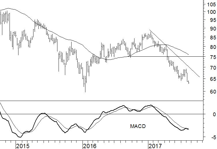 Schlumberger (SLB) laat geen twijfel over het negatieve technische beeld. Sinds eind april het steunniveau rond $75 werd gebroken, bevindt het aandeel zich in een dalende trend. Met een neerwaarts gericht 40-weeks gemiddelde en een negatieve positie van de MACD-indicator is er in de laatste maanden niets veranderd. Zelfs afgelopen week nog werd de dalende trend bevestigd met een nieuw dieptepunt.