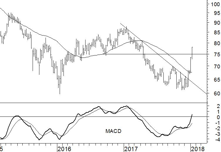 Schlumberger (SLB) heeft in korte tijd een ferme draai gemaakt in het technische beeld. Medio december schreven wij nog dat de dalende trend nog steeds actief was, ondanks hoopgevende signalen. Hoop heeft het gewonnen van angst en Schlumberger breekt met een krachtige beweging de dalende trend. Het maakt vooral indruk dat het aandeel het 40-weeks gemiddelde en de dalende trendlijn in één keer heeft overwonnen. Inmiddels schiet de beurskoers zelfs door tot boven de weerstand rond $75. Daarmee is de dalende trend nu echt tot een einde gekomen.