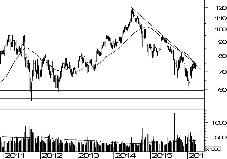 Schlumberger (SLB) heeft een overduidelijke dalende trend. Sinds het hoogtepunt in 2014 werden al diverse lagere toppen en bodems gevormd in de weekgrafiek. De meest recente opleving geeft vooralsnog geen aanleiding om een verandering van dit beeld te veronderstellen. Ook nu stokt de opleving nabij het dalende 40-weeks voortschrijdend gemiddelde dat ook nog eens overeenkomt met de dalende weerstandslijn die over de toppen vanaf 2014 kan worden getrokken. Waar kan het heen met dit aandeel?