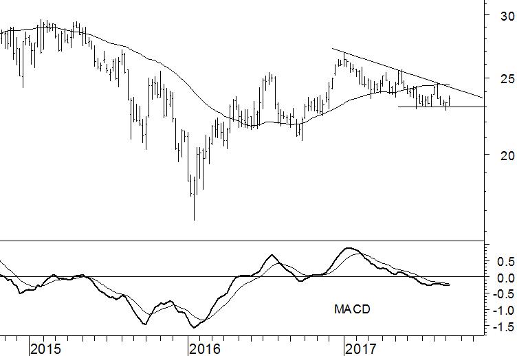 Royal Dutch Shell houdt zich binnen het huidige neutrale trendbeeld amper staande. Koersdruk in het aandeel is zichtbaar in de vorm van de lagere koerstoppen die zich dit jaar hebben gevormd. Ook het feit dat de koers al maandenlang onder het 40-weeks gemiddelde beweegt is een teken van zwakte. Als Shell overtuigend onder het steunniveau rond €23 doorbreekt, zal direct een nieuwe dalende trend in werking treden.