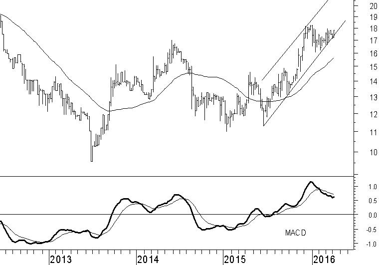 Stern bevindt zich alweer enige tijd in een stabiele stijgende trend. Deze beweegt zich voort binnen de contouren van het stijgende trendkanaal. De laatste weken blijft het aandeel hangen rond de onderkant van het trendkanaal. Dat biedt een uitstekende springplank voor een nieuwe impulsbeweging naar boven. In de komende weken is het meest waarschijnlijke scenario dan ook een sprong omhoog waarbij Stern op zoek kan gaan naar het koersdoel op €21. Dat de onderliggende MACD-indicator negatief is gekruist baart nog niet echt zorgen. Het is een gevolg van het stabiliserende koersverloop in de laatste weken. Zorgen maken wij ons pas wanneer Stern wegzakt onder €17 en daarmee het trendkanaal aan de onderkant verlaat. Dat zal een eerste aanwijzing zijn dat de stijgende trend kwetsbaar is.