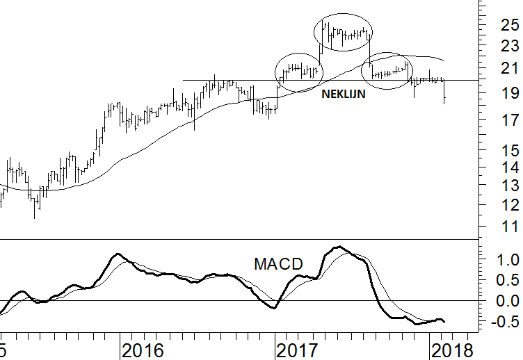 Het is verder van belang dat het 40-weeks gemiddelde van richting is veranderd: van stijgend naar dalend. Dit is een statistisch betrouwbare indicatie dat er een dalende langetermijn-trend is ontstaan. De MACD-indicator leek in de oversold-zone even een koopsignaal te geven, maar dit is inmiddels weer de kop ingedrukt tijdens de laatste daling van de koers. Het koersdoel voor Stern ligt nu rond de €17, met zoals gezegd een verlaging van het advies naar ‘verkopen’.