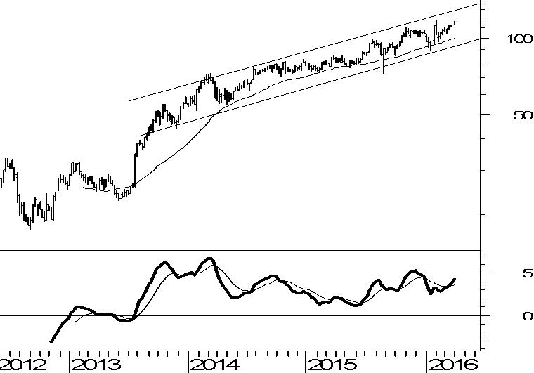 Facebook (FB) werd kort na de beursintroductie in 2012 verguisd. De koers halveerde in korte tijd en het leek er niet op dat het nieuwe aandeel een verrijking vormde voor de Amerikaanse beurs. Maar de critici van het eerste uur is het zwijgen opgelegd. Afgaande op de ontwikkeling van de beurskoers sinds september 2012 is Facebook een succes. In juli 2013 is de stijgende trend gestart en sinds die tijd hanteren wij een koopadvies. Vooral sinds 2014 kent de opgaande lijn een zeer stabiel karakter. Dat blijkt uit de kleine speelruimte tussen de boven- en ondergrens van het stijgende trendkanaal. Recent werd de bovenkant van het trendkanaal bereikt. Dat vraagt om een lichte neerwaartse correctie terug naar de onderkant ervan nabij $100.