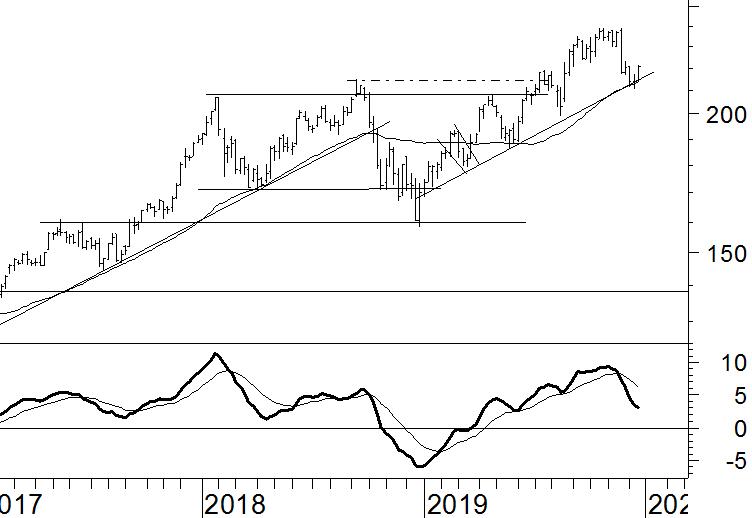 Home Depot staat sinds de zomer op ‘kopen’. De koers doorbrak toen de horizontale weerstand op $210. Echt veel profijt van het koopadvies hebben we nog niet. De koers staat nog maar enkele procenten hoger. Dat komt omdat na de uitbraak de koers eerst weer terugviel en daarna weer steeg, om tot slot opnieuw terug te vallen. De laatste correctie viel overigens keurig terug op de stijgende steunlijn die is getrokken onder de laatste bodems. Tegelijkertijd werd er steun gevonden op het 40-weeks voortschrijdende gemiddelde dat vaak dienst doet als steun bij correcties in een stijgende trend. Er is nu duidelijk een patroon van hoger liggende bodems en toppen in de grafiek waarneembaar. Volgens Charles Dow is er daarmee voldaan aan de vereisten van een stijgende trend. Zolang toppen en bodems hoger liggen, kan de longpositie worden aangehouden.