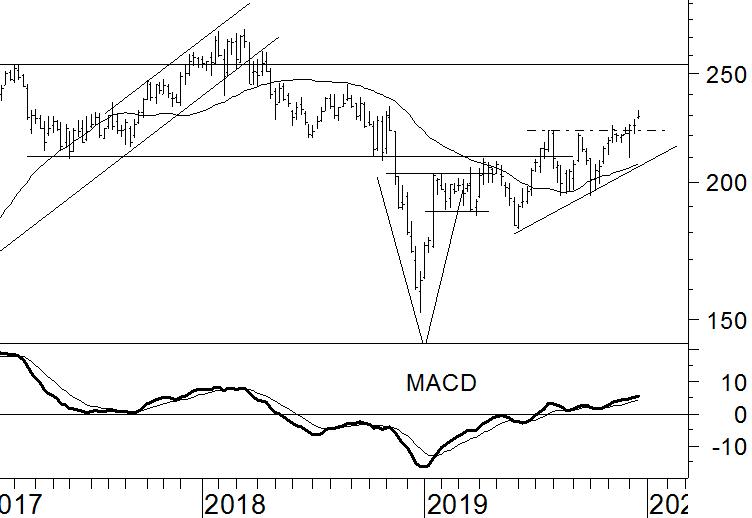 Goldman Sachs staat sinds september op ‘kopen’. Het koopsignaal kwam rijkelijk laat omdat er eerst een V-spike bodem moest worden voltooid. Dat is een bodem waarbij een snelle en diepe daling wordt opgevolgd door een vergelijkbare snelle en harde stijging. De V-spike werd in het eerste kwartaal van dit jaar voltooid. Ik kocht het aandeel toen niet meteen, omdat het 40-weeks voortschrijdend gemiddelde nog dalende was en weerstand bood bij verder oplopende koersen. Pas toen in september de indicatoren positief draaiden en de koers een belangrijke horizontale weerstand op $210 uitnam, kon het aandeel op de lijst van koopadviezen worden gezet. Na een korte en beperkte stijging leken de bulls steeds meer moeite te krijgen met de weerstand op $222. Recent heeft de koers deze weerstand uitgenomen en nu ligt de weg naar $252 open.