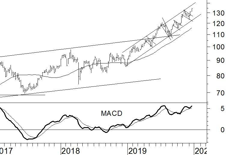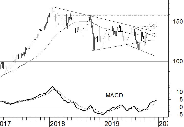 Caterpillar staat sinds begin november op ‘kopen’. De koers brak toen uit een grote neutrale driehoeksformatie en er werd tevens een hogere top gevormd, na een hogere bodem. Tot slot draaiden toen ook de indicatoren positief. Na de uitbraak uit de driehoek wist de koers ook snel af te rekenen met de weerstand van een oude top op $140. Maar toen de doorbraak eenmaal een feit was, ging het niet snel meer. Sterker nog, conform het adagium ‘oude weerstand wordt nieuwe steun’ tracht de koers angstvallig steun te vinden op de $140. Zolang dit lukt, blijft het positieve technische plaatje intact en kan het aandeel op de lijst van koopadviezen blijven staan. De eerste belangrijke weerstand ligt op $160, het niveau van een aantal belangrijke toppen uit het verleden. Daarboven doemt de weerstand van de top van begin 2018 op $173 op als koersdoel.