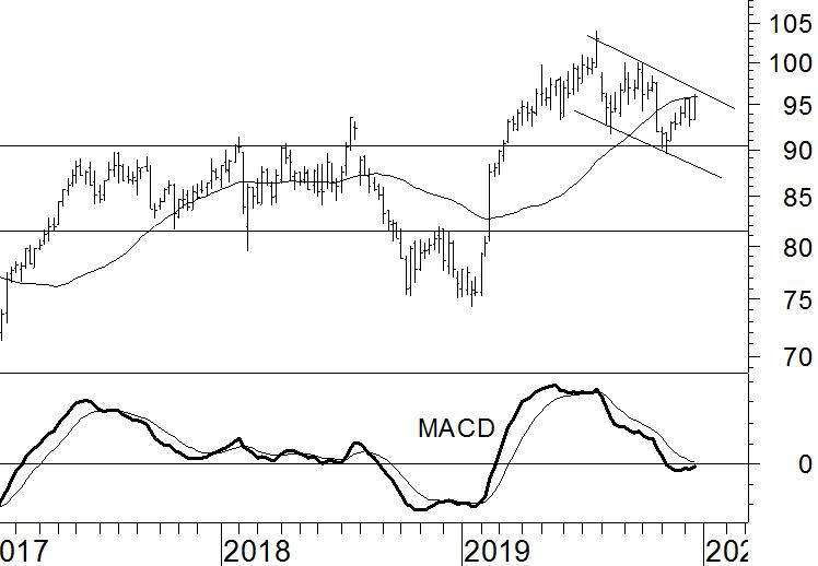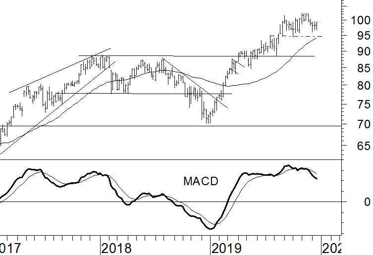 Vinci staat sinds april op ‘kopen’. De koers doorbrak toen de belangrijke horizontale weerstand op €88. De koers steeg na het koopadvies aanvankelijk niet zo hard. Sterker nog, hij viel terug op de oude weerstand volgens het bekende adagium ‘oude weerstand wordt nieuwe steun’. De pullback was succesvol. Met andere woorden: de terugval kwam precies terug op het oude uitbraakniveau, waarna de koers met een nieuwe stijging aanving. De koers steeg toen van globaal €88 naar €103, maar de laatste maanden wil het niet echt vlotten. Technisch is er echter nog weinig aan de hand. Zolang de koers zich handhaaft boven de horizontale steun op €95 (zie stippellijn) is er geen reden om winst te nemen. Op dit niveau ligt nu ook het 40-weeks voortschrijdende gemiddelde dat bij correcties in een stijgende trend steun zou moeten bieden.