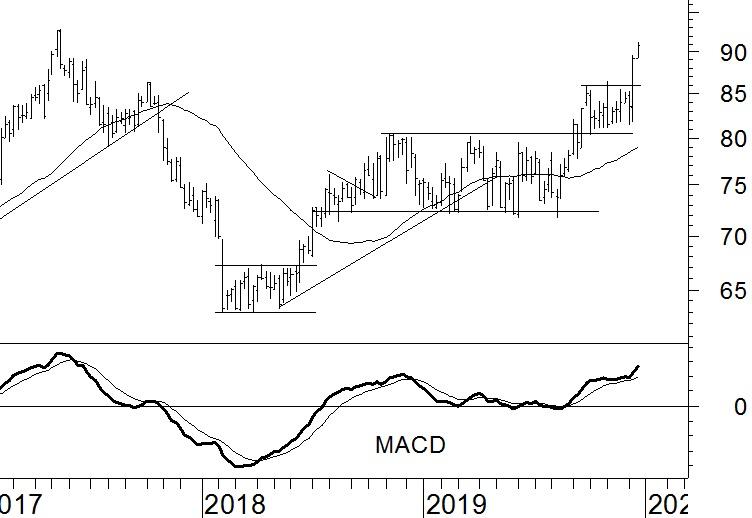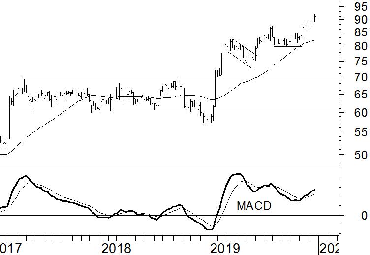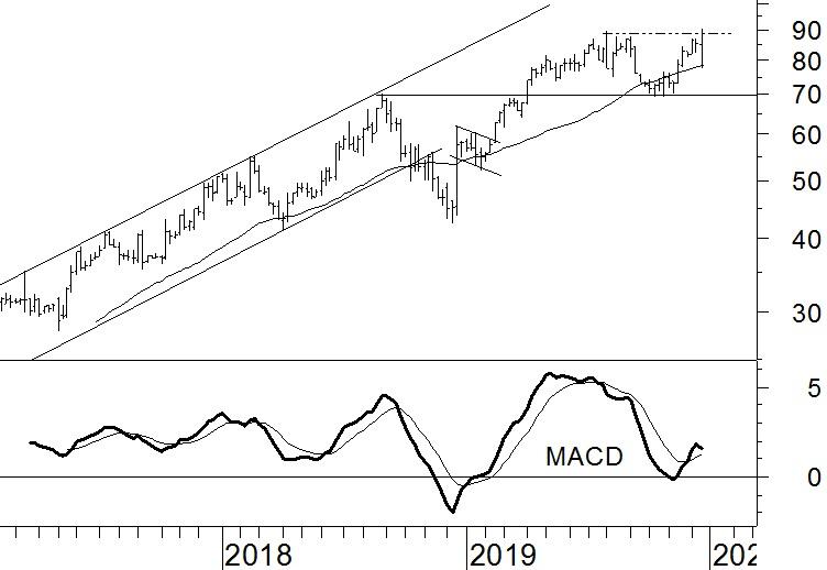 Sanofi staat sinds oktober 2018 op ‘kopen’. De koers had daarvoor al een aantal positieve ontwikkelingen laten zien. Zo was het aandeel in het voorjaar van vorig jaar uit een zijwaartse range met weerstand op €67 gebroken. In juli 2018 kroop de MACD boven de nullijn. Toen in oktober 2018 de hellingshoek van het 40-weeks voortschrijdend gemiddelde positief werd, kon het aandeel eindelijk gekocht worden. Inmiddels staat de winst op de longpositie op 20%, maar het heeft lang geduurd om dit te bereiken. Na het koopadvies kwam de koers namelijk bijna een jaar lang in een zijwaartse beweging met steun op €72 en weerstand op €80 terecht. Enige maanden geleden brak de koers hier eindelijk uit, hetgeen het eerder afgegeven koopadvies bevestigde. De koers haperde de laatste weken op het €86-niveau, maar dat is nu ook geslecht.