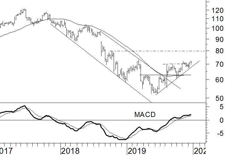 Bayer is nog niet zo lang geleden op ‘houden’ gezet, namelijk toen de koers uit het dalende trendkanaal en door de horizontale weerstand op €62,50 brak. Het wordt tijd het advies verder naar boven bij te stellen. Een koopadvies is nu om verschillende redenen gerechtvaardigd. Ten eerste ontstaat er een steeds duidelijker patroon van hogere liggende toppen en bodems. De bodems kunnen inmiddels met een stijgende steunlijn verbonden worden. Ten tweede staan de indicatoren al een aantal maanden in de koopmodus. Zo ligt de MACD boven de nullijn. Ten derde lijkt de koers afgerekend te hebben met de weerstand van het €70-niveau. De uitbraak hierboven is nog maar pril, maar geeft voldoende onderbouwing aan het nu positieve technische plaatje. Het eerste koersdoel is nu de weerstand van de top van oktober 2018 op €80.