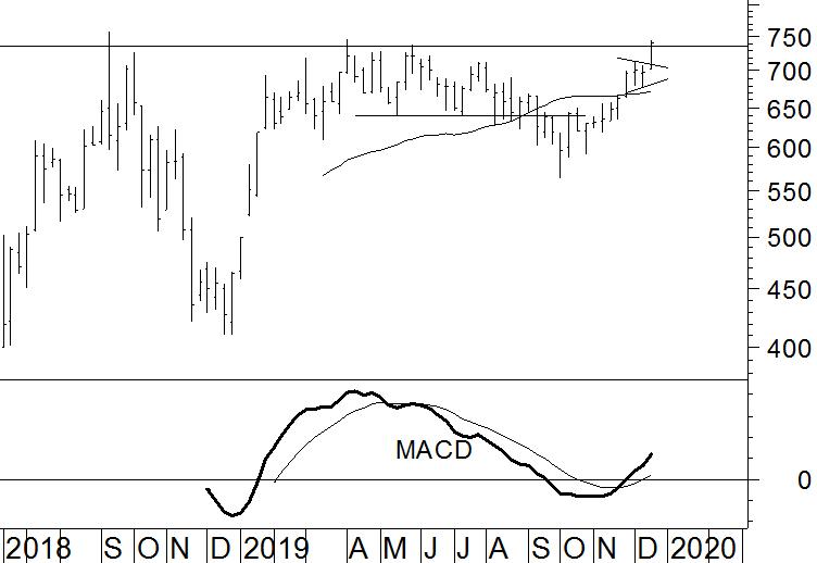 Adyen heeft ons niet zo lang geleden op het verkeerde been gezet. In de herfst zakte de koers namelijk nog uit een zijwaartse range, waarna het aandeel een shortadvies kreeg. Maar toen het daarna krachtig herstelde en door het 40-weeks gemiddelde brak, moest het weer terug op de lijst van houdadviezen worden gezet. Nu is koers verder gestegen. Sterker nog: het aandeel heeft de belangrijke horizontale weerstand op €740 uitgenomen. Dat lukte tweemaal eerder, waarna het vervolgens fout ging. Een sterke daling is nu echter niet te verwachten. Het aandeel verdient daarom een koopadvies. De koers heeft recent een wimpel uitgenomen. Dit is een pauzepatroon dat doorgaans halverwege een bepaalde koersbeweging ligt. Aangezien de stijging tot aan het patroon meer dan €100 bedroeg, zou de koers in potentie met een vergelijkbaar bedrag kunnen stijgen.