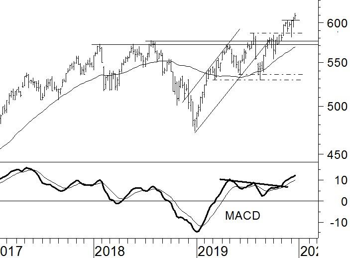 De AEX heeft afgerekend met de zone tussen 584 en 586. Daarna is ook de belangrijke barrière van het 600-niveau doorbroken. Dit betekent dat er voorlopig geen weerstanden meer zijn. Op 570 lag nog een laatste, belangrijke weerstand, namelijk de top van voor de kredietcrisis. Geen weerstanden betekent volgens de technische analyse in potentie een groot stijgingspotentieel. De indicatoren ondersteunen dit scenario. Het 40-weeks voortschrijdende gemiddelde, waarvan de richting altijd goed de langetermijntrend weergeeft, heeft een stijgend verloop. De MACD staat boven de nullijn en heeft bovendien een negatief divergentie met de koers afgewend door af te rekenen met een dalende weerstandslijn getrokken over de laatste toppen. De AEX mag terugzakken tot de zone zonder 584-586 zonder de stijgende trend in gevaar te brengen.