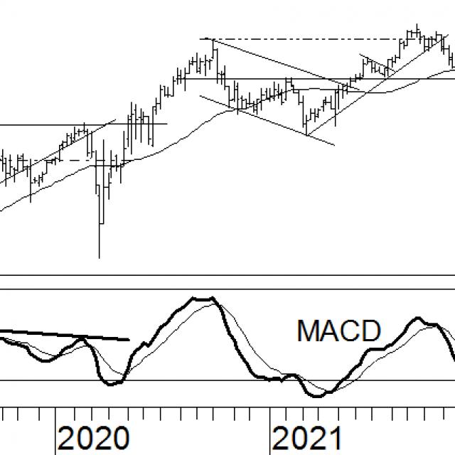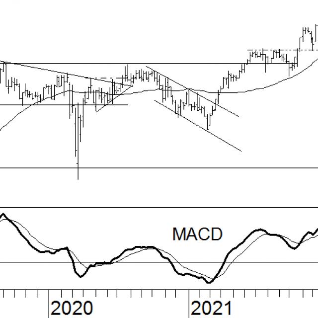 In april heeft Nestlé een koopadvies gekregen. Dit kwam tot stand door een stijging tot boven het neerwaartse trendkanaal, waarna er spoedig een positieve draai plaatsvond in de trendindicatoren. Nadien heeft de koers het zware weerstandsniveau op CHF112 doorbroken, om vlak hierboven opnieuw weerstand te ondervinden. Na ook dit niveau achter zich te hebben gelaten, bevindt het aandeel zich nu in ‘uncharted territory’. Dit is het geval wanneer de koers zijn all time high doorbreekt en geen weerstanden meer voor zich heeft. Hierdoor heeft het aandeel alle vrijheid om naar nieuwe hoogtes te stijgen. Dit brengt echter wel gevaar met zich mee, omdat er geen referentiepunten zijn. De indicatoren duiden echter onmiskenbaar op een stijgende trend. De MACD is positief en de koers staat hoger dan het 40-weeks voortschrijdend gemiddelde. Het koopadvies blijft dus staan.